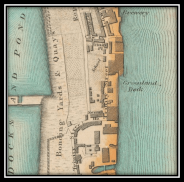 This is Greenland Dock, formerly part of the Howland Great Wet Dock. It is presently named for the Whalers returning from Greenland with Whale-Oil to light our Lamps, one of which will light our Path tonight. These Waterman’s Stairs are named for it, too. Mr. Lockie has assured me they provide the most economical Route to our destination, Trinity-Street. He told me that the “continuation of Lower Queen-St. being parallel to the Thames, it leads to Russell-St. and Greenland Dock”.[5]