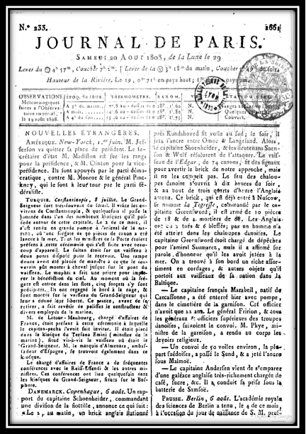 [3] Narrator’s translation of “Nouvelles Étrangeres”, in Journal de Paris, Samedi, 20 Août 1808, de la Lune le 29, No. 233, p. 1661.
