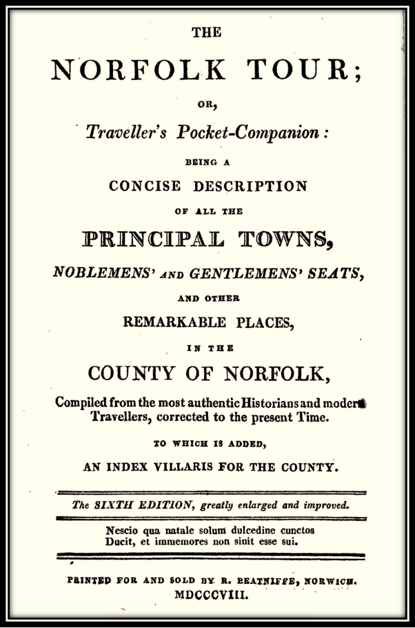 [5] Mr. Richard Beatniffe, The Norfolk Tour; or, Traveller’s Pocket Companion, Being a Concise Description of all the Principal Towns, Noblemens’ and Gentlemens’ Seats, and other Remarkable Places in the County of Norfolk, Compiled from the most authentic Historians and modern Travellers, corrected to the present Time. Sixth edition. Printed for and sold by Mr. R. Beatniffe, Norwich, MDCCCVIII [1808], p. 12.