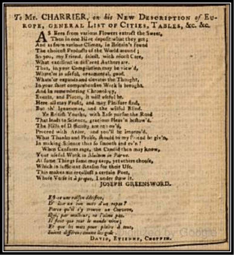[6] Mr. Joseph Greensword, “To Mr. Charrier, &c. &c.”, in A New Deſcription of Europe, in various Columns, whereby is exhibited in one View, all its Empires, Kingdoms, Republics, and States, &c. [in an Enumeration too long to copy]; The whole, being Multum in Parvo, is compoſed, calculated, and compiled, from the beſt Authors, by M. J. S. Charrier, Teacher of Geography, the Uſe of the Globes , the French Language, &c. Author of the Chorographical Deſcription of England and Wales, the geographical Tables of noted Cities, Improver and Editor of Dr. Nugent’s Pocket Dictionary, French and Engliſh, &c . Printed for the Author by Mr. J. W. Pasham, Black-Friar; and Sold by the Author only, who may always be heard of, at Mr. Dilly’s, No. 22, Poultry, 1781.